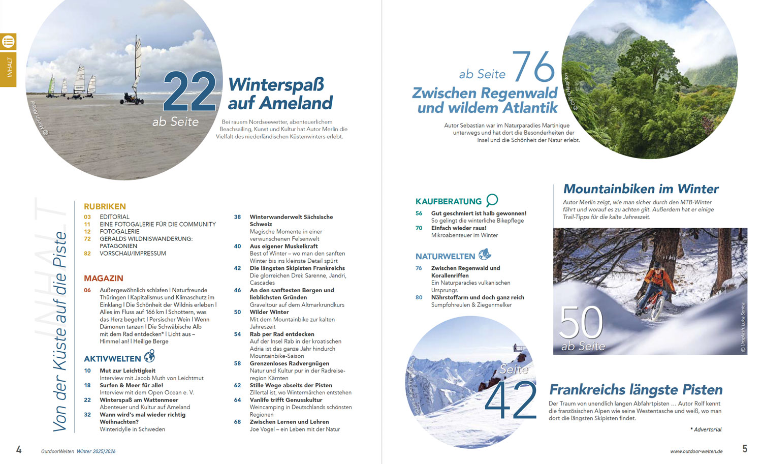 Winterausgabe 2025/2026: Ihr findet u. a. folgende Themen im Magazin: - Winterspaß am Wattenmeer: Abenteuer und Kultur auf Ameland - Vanlife trifft Genusskultur: Weincamping in Deutschlands schönsten Regionen - An den sanftesten Bergen und lieblichsten Gründen: Graveltour auf dem Altmarkrundkurs - Zwischen Regenwald und Korallenriffen: Ein Naturparadies vulkanischen Ursprungs - Neuer Teil der Serie „Geralds Wildniswanderungen“: Durch das unbekannte Patagonien - Gut geschmiert ist halb gewonnen! So gelingt die winterliche Bikepflege