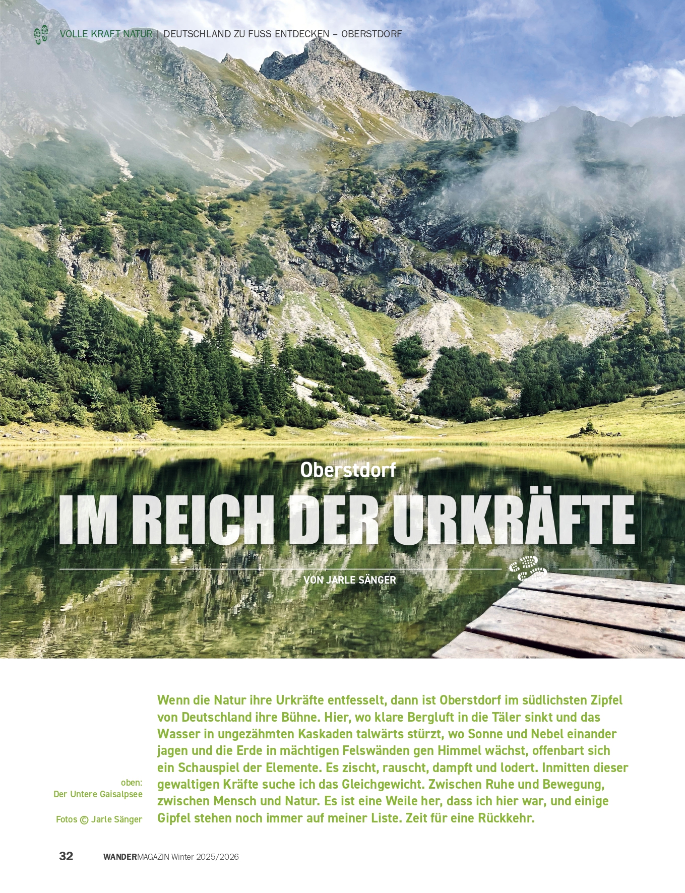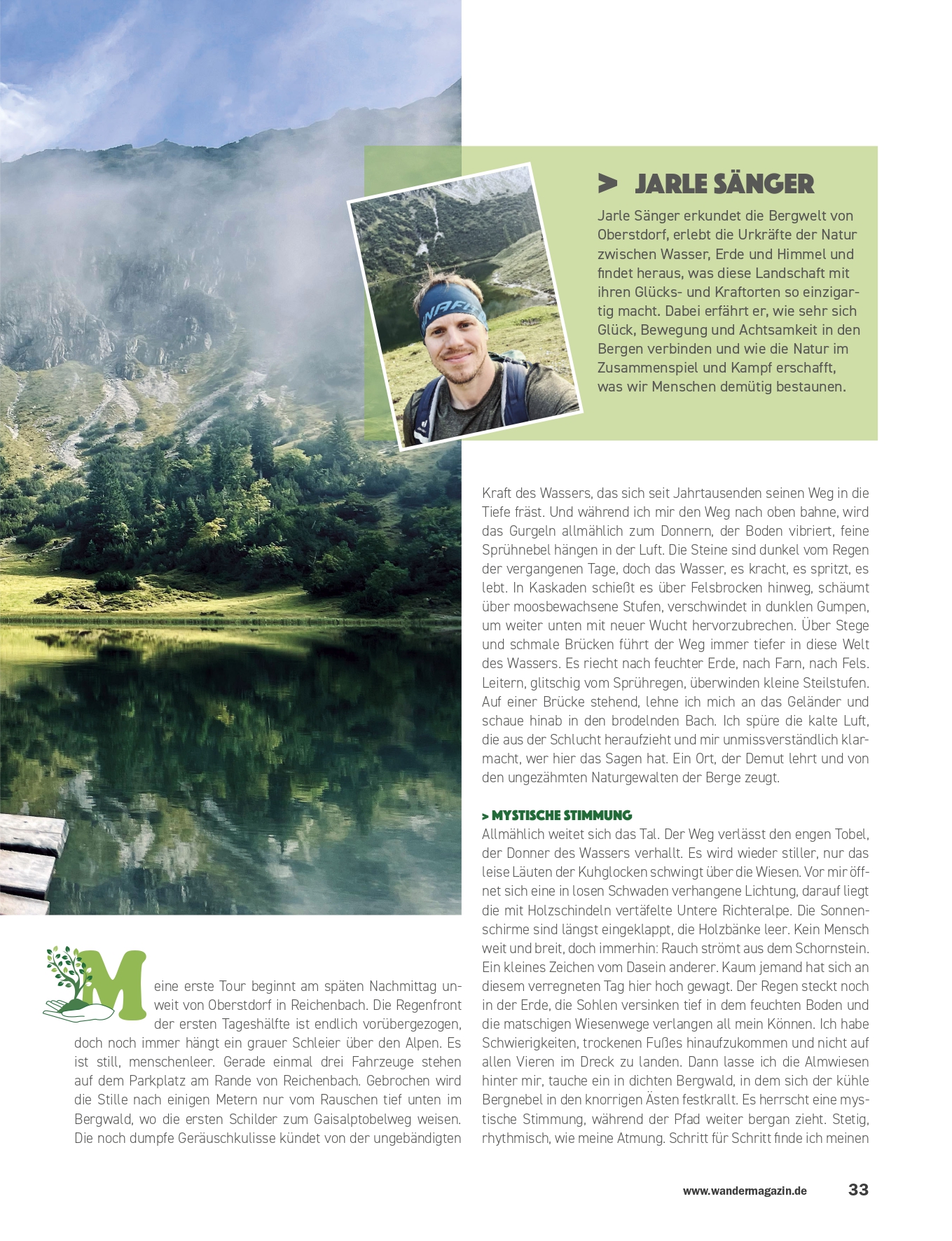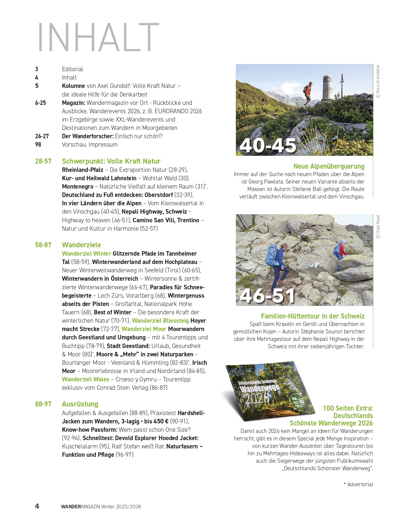Schwerpunkt: Volle Kraft Natur: Lasst euch inspirieren von Wanderungen in Rheinland-Pfalz, Lahnstein oder im fernen Montenegro. Hoch hinaus geht es mit Berichten zum Reich der Urkräfte Oberstdorf im Allgäu, einer Alpenüberquerung vom Kleinwalsertal ins Vinschgau oder zum Nepali Highway in der Schweiz. Dazu ein Abstecher auf den Camino San Vili im Trentino.