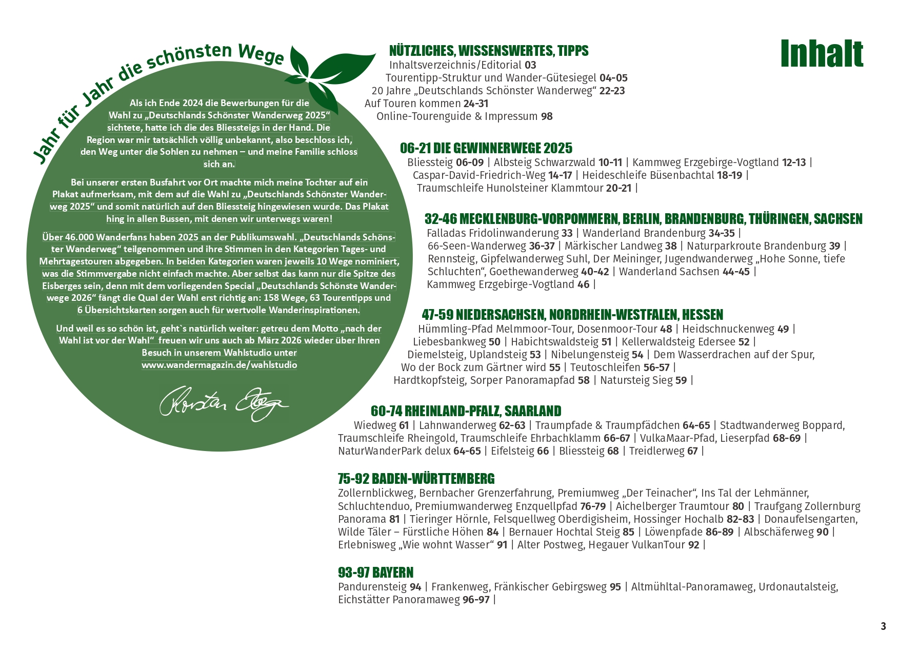 Special inklusive: Deutschlands Schönste Wanderwege: Unser beliebtes Jahresspecial in der neusten Auflage ist wieder da. Stöbert durch 158 Wanderwege, 63 ausführliche Tourentipps sowie 6 Übersichtskarten. Findet konkrete Tourentipps in ganz Deutschland: Von Mecklenburg-Vorpommern, über Berlin, Brandenburg und Thüringen, Sachsen und Hessen bis in den Westen und Süden der Republik. Egal ob Tages- oder Mehrtagestour, ob Rundwanderweg oder Streckentour. Außerdem könnt ihr euch umfassend über die Gewinner der Publikumswahl "Deutschlands Schönster Wanderweg 2025" informieren.